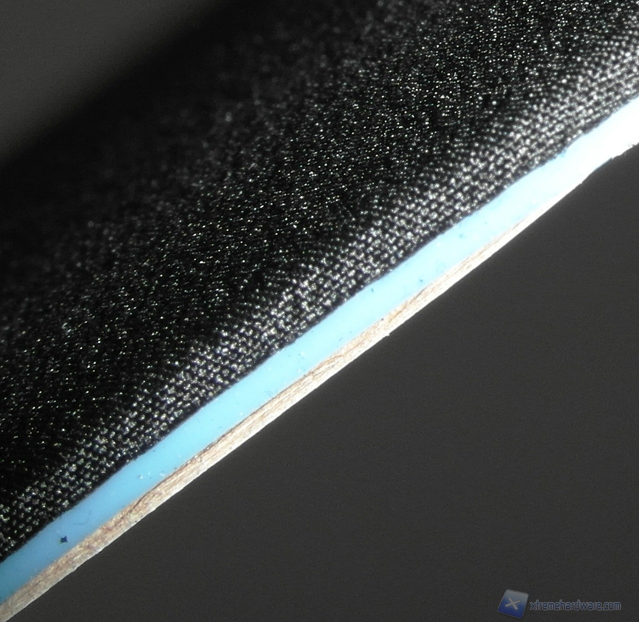 Di lato possiamo osservare la composizione a 2 strati dell’Hiro, la gomma azzurra offre un ottimo grip con la scrivania ed è decisamente bello l'effetto che si può ammirare lateralmente.