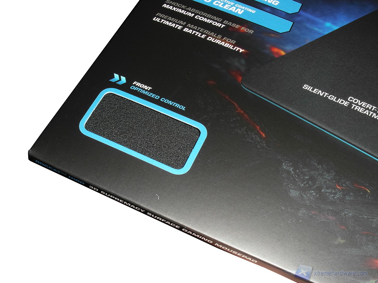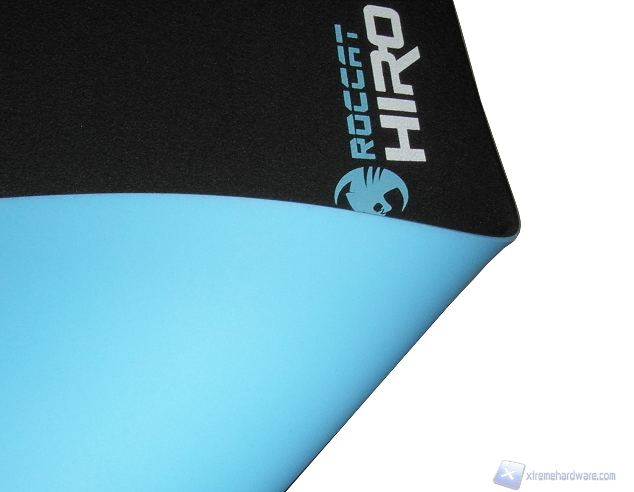 Il ROCCAT Hiro è di medie dimensioni, tuttavia nonostante i suoi 350x250 mm lo spessore è di soli 2,5 mm, aspetto importante nella scelta di un mousepad. La superficie, morbida, è resa particolare dal trattamento vulcanizzante alla quale è stata sottoposta, ottenendo un effetto bucciato (o 3D) per massimizzare la tracciatura del mouse. In basso a sinistra è inoltre presente il logo ROCCAT.