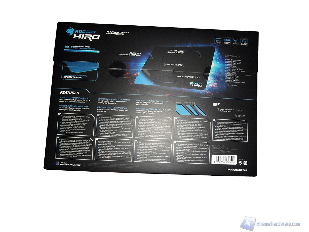 Vediamo la confezione: il mousepad ci arriva non arrotolato, sicuramente un aspetto positivo, sulla confezione di colore nero e blu troviamo, messi ben in evidenza, il nome, HIRO appunto, e alcune sue interessanti features.