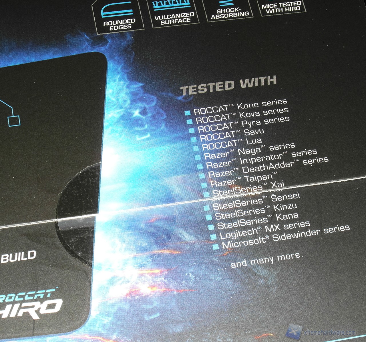 Dei tagli nella confezione lasciano intravedere l'Hiro nella parte inferiore, mentre in alto a destra troviamo un elenco di compatibilità con i mouse Roccat e non.