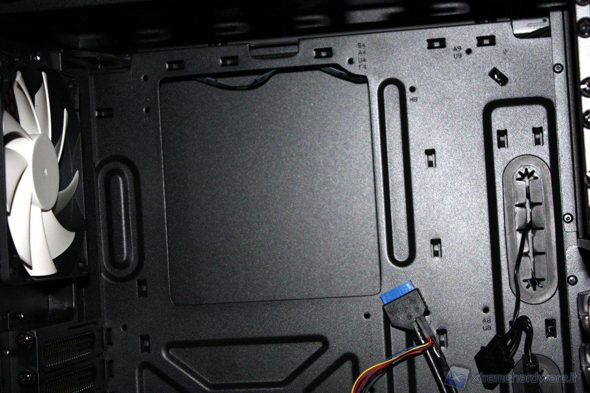 La piastra sulla quale va montata la scheda madre è dotata di un comodo foro in corrispondenza dell'alloggio della CPU per consentire la sostituzione di eventuali dissipatori dotati di backplate, senza dover per forza rimuovere la motherboard dal case stesso. Inoltre sono presenti dei comodissimi fori, dotati di guaina, che garantiscono l'alloggio dei cavi nell'intercapedine tra la paratia laterale del case e la piastra della scheda madre, permettendo così un'organizzazione più pulita all'interno del Tempest 410. I fori non sono però disposti in doppia fila e nel caso di utilizzo di schede madri piuttosto strette, lasceranno scoperti una parte dei cavi, nel tratto tra scheda madre e guaina.