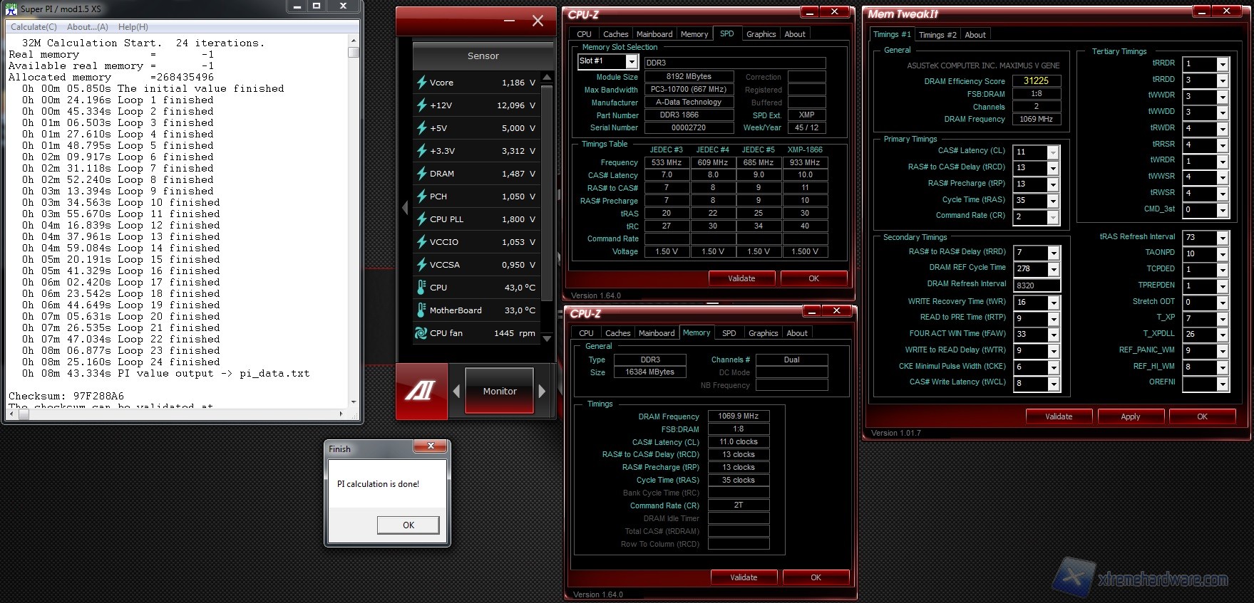 Questo tool sollecita il processore nel calcolo del PiGrego consentendo di calcolare finoa a 32 milini di decimali (Super PI 32M). Logicamente più è esoso il calcolo, più lo stadio CPU-RAM viene sollecitato. Questi i risultati raggiunti: