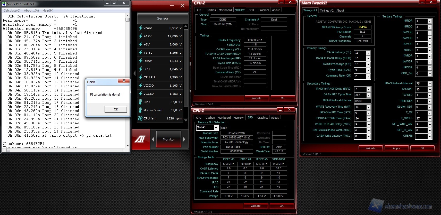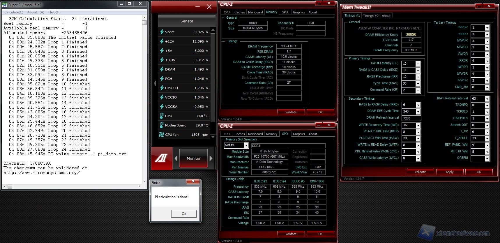 La pratica dell’overclock al giorno d’oggi conta migliaia di utenti. In sostanza per dare una definizione semplice al concetto, è la pratica con cui si spingono i componenti di un computer come ad esempio CPU, RAM, VGA ad operare ad una frequenza maggiore al fine di ottenere un beneficio tangibile in termini di denaro (in quanto si riesce ad eguagliare modelli di gamma superiore spendendo meno) e prestazionale (in termini di tempi di risposta inferiori di tutto il sistema). Non sempre questa pratica è possibile in quanto bisogna fare i conti in primo luogo con il problema della dissipazione del calore, ed in secondo luogo non tutti i componenti sono predisposti per questa pratica. Questo sia per un discorso qualitativo (e quindi di purezza dei chip) che di veri e propri blocchi a livello hardware (ossia sui moltiplicatori come per il caso dei processori Intel di fascia non Extreme). In questo caso restando sul concetto di RAM, la barriera su cui ci si scontra è solo un problema di qualità dei chip di memoria installati sul modulo.Per misurare quindi il potenziale delle ADATA AX3U1866XW8G10-2X ossia la capacità delle memorie progettate principalmente per lavorare alla frequenza standard di 1866MHz ad operare ad una frequenza maggiore e dare il meglio di se in ambito overclock, abbiamo incrementato moderatamente la frequenza del processore oltre quella di default che trattandosi di un Intel Core i7-3570K, è di 3400MHz (3800MHz in modalità Turbo). Per i test abbiamo utilizzato il noto tool SuperPI, utilizzato anche in ambito competitivo e di benchmark sul noto portale Hwbot.org.